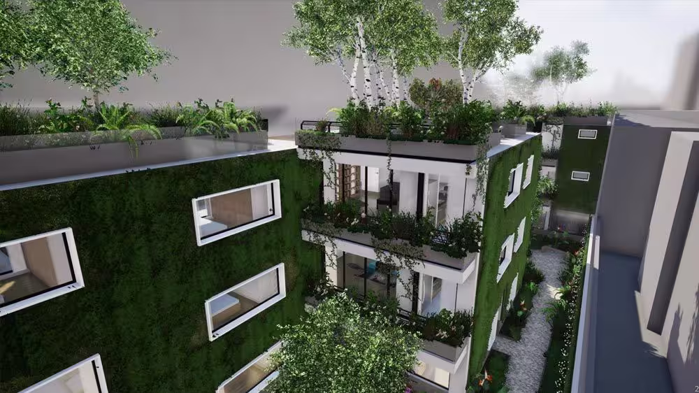 Die reiche Pflanzenwelt Kolumbiens prägt auch die Architektur: begrünte Dächer als gemeinschaftliche Rückzugsorte, bepflanzte Innenhofwände und üppige Gärten schaffen frische Luft und ein angenehmes Klima.