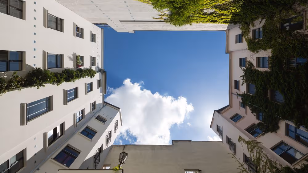 Das Gebäudeensemble besteht aus insgesamt drei Bauteilen, welche durch begrünte Höfe miteinander